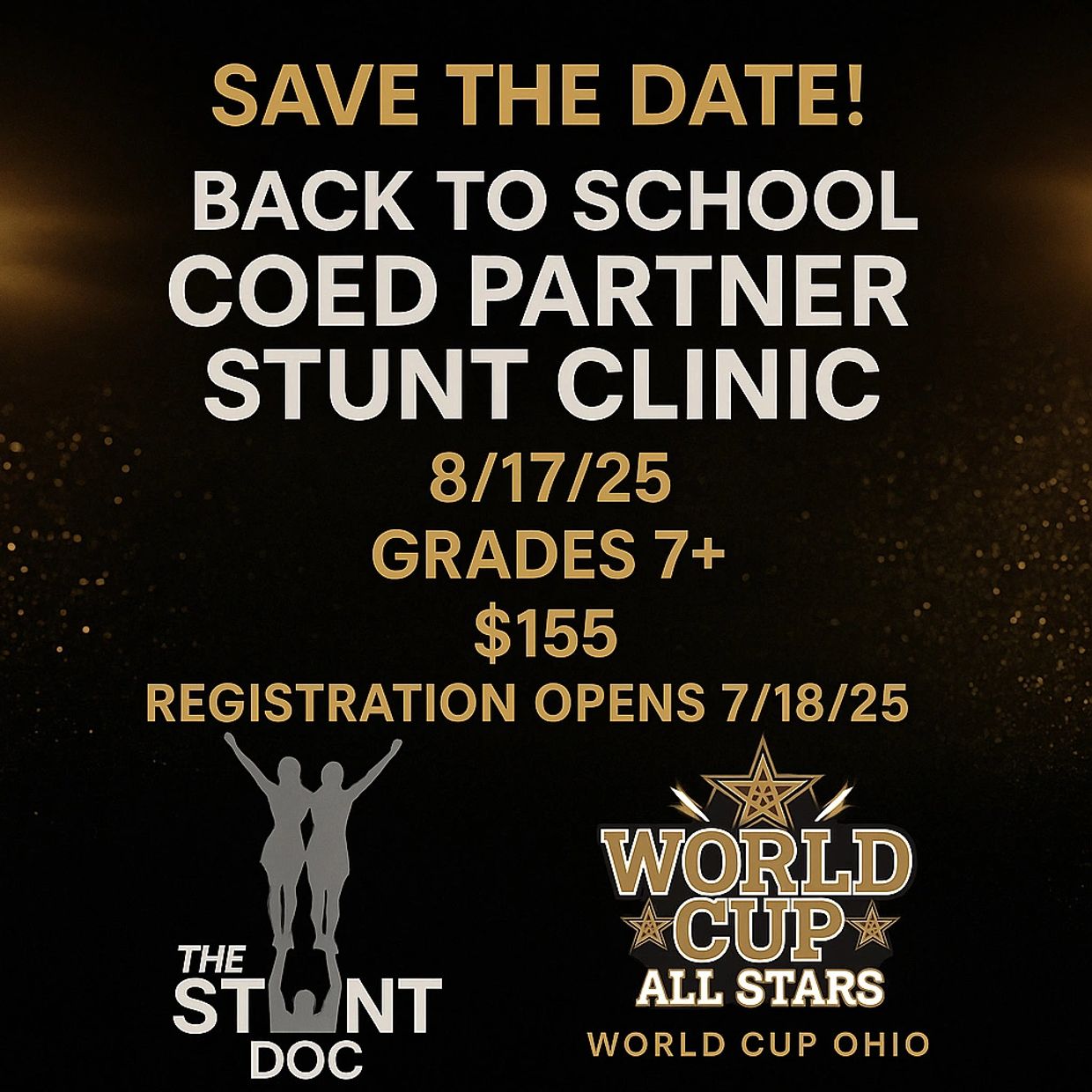 Are you looking to learn how to coed partner stunt or enhance your skills? The Stunt Doc is proud to present the first “Back to School Coed Stunt Clinic” at World Cup All-Stars in Grove City, Ohio.